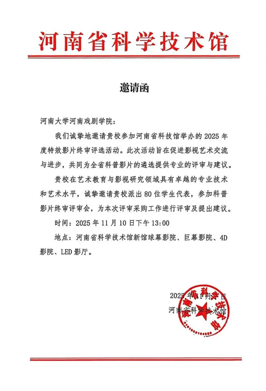 11月10日,受河南省科学技术馆诚挚邀请,河南大学河南戏剧学院2023级广播电视编导、2025级戏剧影视导演和2025级戏剧影视文学专业近百名师生共赴省科技馆,深度参与河南省科学技术馆2025年度优秀科普(特效)影片遴选和终审评选活动,为河南省优秀科普影片的遴选采购工作提供专业的评审与建议。评审结束后,河南省科学技术馆副馆长丁文萍对我院给予此项评审活动的大力支持表示感谢,对我院学生扎实的专业基础,严谨的专业素养表示充分认可,并对我院有序组织和学生优良作风表示高度赞赏。我院党群工作部、学生工作部、学生党支部负责人和辅导员代表一同参加了评审活动。在观看过程中,大家全神贯注,不错过任何一处细节。从技术水平维度,他们严谨观察影片的拍摄手法、特效制作的精细度等,判断是否运用了先进且合适的影视技术来展现科普内容;在内容水平方面,他们着重考量科普知识的准确性、逻辑性以及对观众的吸引力;艺术水平上,他们侧重分析影片的画面构图、色彩搭配、音乐运用等是否具有艺术美感,能否通过艺术化的手段增强科普的感染力;对于设备契合度,学子们结合不同影厅的球幕、巨幕、4D、LED等设备特点,评估影片在相应设备上的播放效果,看是否能充分发挥设备优势,为观众带来沉浸式的科普体验。随后,我院师生认真为每部影片进行评审打分,为河南省科学技术馆科普影片的优化和采购提供了专业且有价值的参考。我院师生积极参与河南省科学技术馆2025年度特效影片终审评选活动,体现了我院“理论与实践并重”的教学理念,既丰富了实践平台,还提升了专业素养。这是我院师生本学期第二次深度参与河南省科学技术馆相关专项活动,进一步促进了我院与河南省科学技术馆的交流与合作,有效提升了河南科普影视文化和艺术的传播。今后,学院将进一步扩大与各大院馆的合作,为学生创造更多高水平的专业实践平台,助力学生专业技能提升。