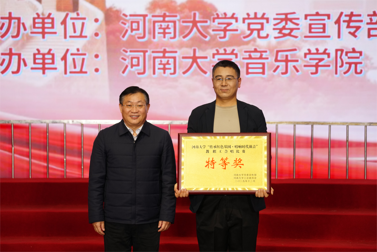 12月6日,由河南大学党委宣传部、河南大学工会委员会主办,河南大学音乐学院承办的“传承红色基因·唱响时代强音”教职工合唱比赛在金明校区隆重举行,来自校机关、各二级单位的45支队伍齐聚一堂,用歌声表达对祖国的深情热爱,展现新时代高校教育工作者昂扬向上的精神风貌。代表我院出征的教职工合唱团,以一曲磅礴深情的《英雄赞歌》震撼全场,凭借精湛的艺术表现和饱满的精神状态,在众多优秀队伍中脱颖而出,以总分第一的成绩,一举夺得本次比赛的最高荣誉——特等奖!河南大学党委副书记李平为我院教工代表颁奖接到比赛通知,我院党委高度重视、迅速部署、即刻动员,各系部教师积极响应、踊跃报名、共同参与,一支跨系部、跨岗位的院级教职工合唱团迅速组建,正式成立。选定《英雄赞歌》为参赛曲目后,合唱团成员在保障日常教学、科研与管理工作之余,充分利用课余及休息时间,全心投入排练。从音准磨合、声部协调,到情感表达与舞台呈现,每一次练习都体现了大家对艺术的严谨追求、对经典作品的深入理解,更凝聚着对河南戏剧学院的真挚热爱。12月6日下午,我院教职工合唱团集体乘坐大巴提前抵达现场,有序进行最后的准备工作。换装、化妆、开声练习,各环节衔接顺畅、从容高效。期间,我院执行院长张国强利用赛前有限时间对合唱做最后技术指导,院党委副书记张润泳也来到后台,关切询问准备情况,并向老师们致以鼓励与问候,使团队成员倍感温暖,士气倍受鼓舞。在正式比赛中,我院教职工合唱团成员仪态端庄,精神饱满,气势昂扬。音乐前奏响起,肃穆而庄重的氛围顷刻间笼罩全场,随着“风烟滚滚唱英雄……”的歌声深情迸发,瞬间吸引了全场观众的注目。男声部铿锵有力、气势恢宏,女声部婉转深情、细腻动人,多声部交织融合,情感逐层推进,展现出高超的合唱艺术水准。老师们不仅以扎实的声乐功底传递音乐之美,更通过精准的眼神交流、真挚的面部表情与协调的肢体语言,生动诠释了歌曲所蕴含的英雄气概与崇高精神。尤其在演唱至“为什么战旗美如画,英雄的鲜血染红了它”时,庄严深沉的表达令在场观众无不为之动容,将现场氛围推向高潮。歌声落下,现场掌声经久不息。最终,河南大学河南戏剧学院教职工合唱团凭借对《英雄赞歌》的深刻理解与精湛演绎,在比赛中脱颖而出,荣获特等奖。这一荣誉不仅是对全体参演教师艺术素养与舞台表现力的高度肯定,更是我院凝聚力与团队精神的集中体现。本次合唱比赛虽已落幕,但《英雄赞歌》的旋律与精神已内化于心。这不仅是一场艺术展示,更是一次深刻的精神凝聚与集体洗礼。我院教职工通过歌声礼赞英雄、传承红色基因,充分展现出团结拼搏、追求卓越的精神风貌。此次荣获特等奖,将进一步激励全院教职工,把比赛中凝聚的协作精神、拼搏热情与艺术追求,转化为立德树人、潜心治学的实际行动,在未来的教育工作中继续践行初心,培育更多担当民族复兴大任的时代新人。
