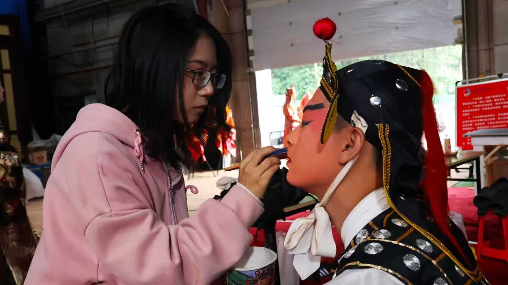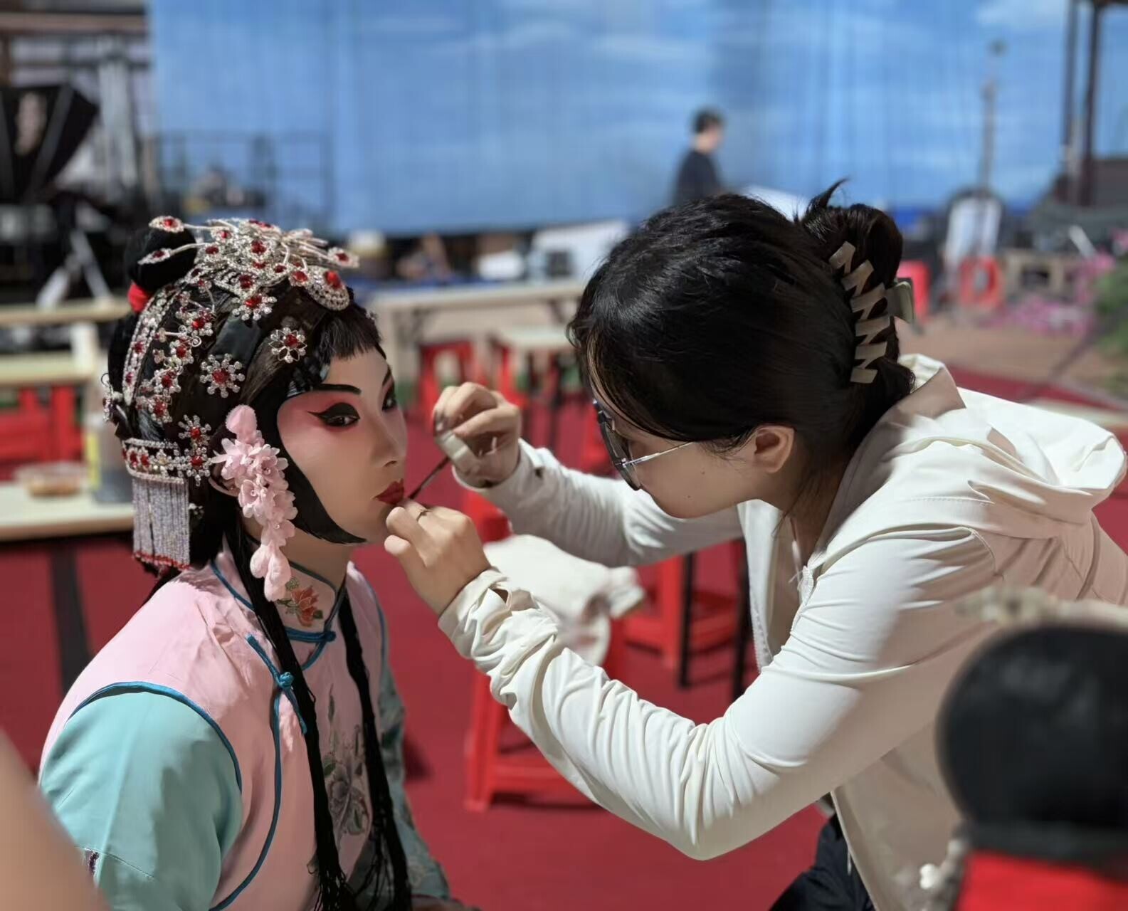 其中,舞台美术系师生深度融入各拍摄环节:人物造型专业师生全面参与演员化妆工作,同时学习戏曲服饰规制;服装设计专业教师参与演员服饰穿戴;灯光设计专业师生观摩学习拍摄照明。作为两部影片的领衔主演,学院院长于魁智和艺术总监李胜素言传身教,为舞台美术系学生讲解戏曲化妆和服饰规律。