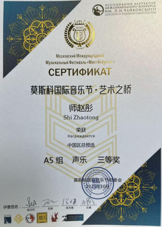 近日,2026年莫斯科国际音乐节中国赛区总预选赛在北京圆满落幕。经过激烈比拼,我校戏剧音乐系学生王浩帆获得声乐A5组二等奖(小组第二)、师赵彤荣获A5组声乐三等奖。李玲老师荣获声乐专业优秀指导教师。本次比赛汇聚了来自中央音乐学院、中国音乐学院、上海音乐学院、沈阳音乐学院、四川音乐学院等多所国内顶尖音乐院校的优秀选手,竞争激烈。