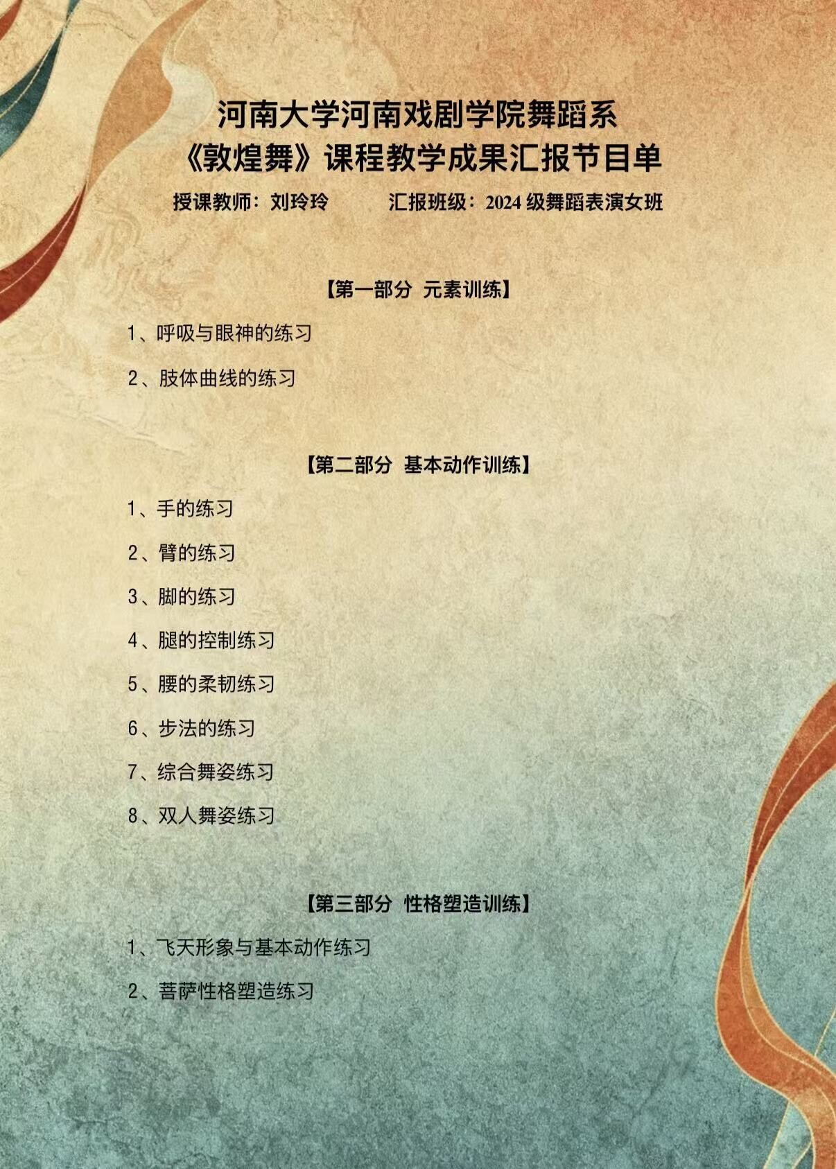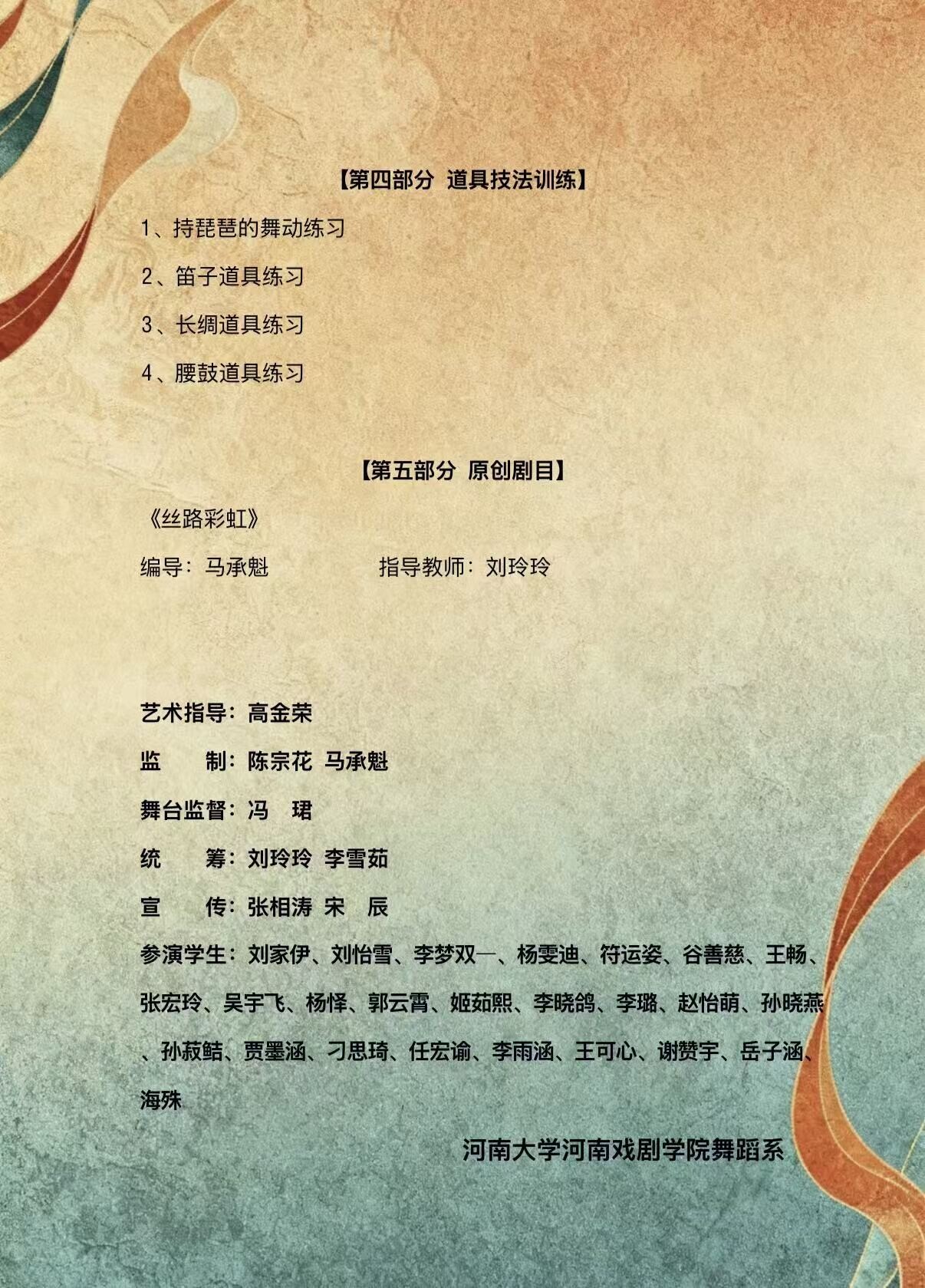 为充分展示河南大学河南戏剧学院舞蹈系教学成果和编创能力,经过前期精心筹备,舞蹈系将于2026年1月16日(星期五)下午3:00于梅花剧场举办《敦煌舞》课程教学汇报展演。届时,由中国著名舞蹈教育家、我院舞蹈系主任马承魁编导,刘玲玲教师指导的原创舞蹈剧目《丝路彩虹》将精彩亮相。